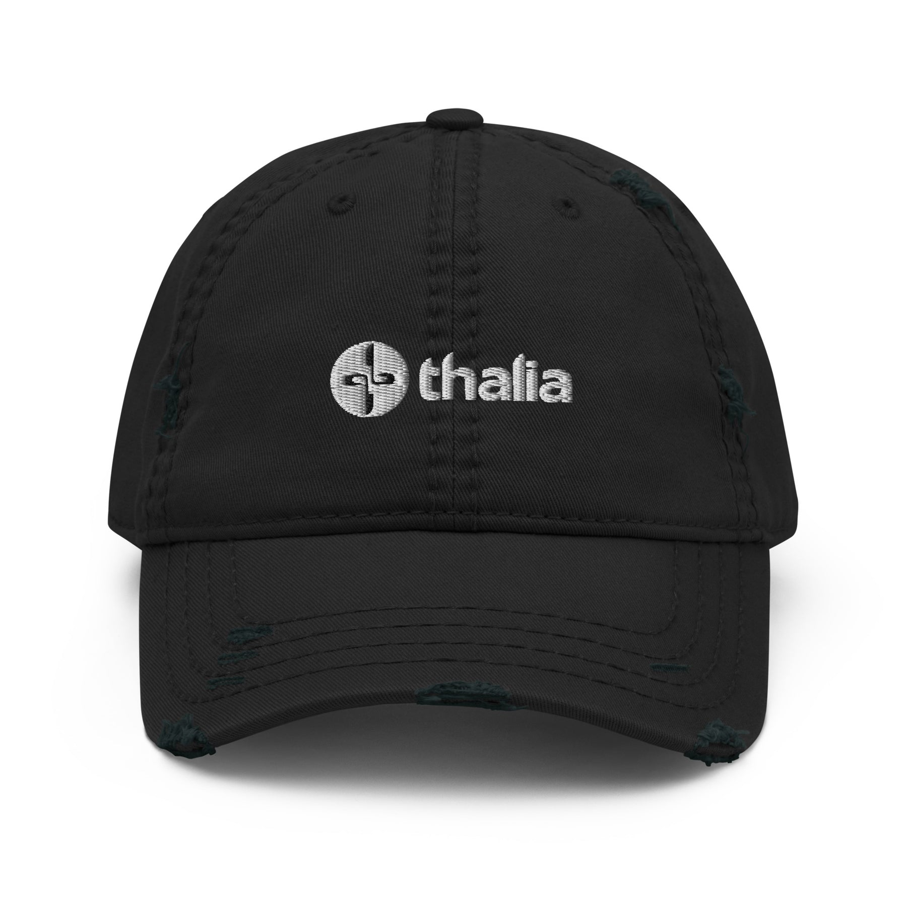 Thalia Logo embroidered distressed dad hat. With a slightly distressed brim and crown fabric.