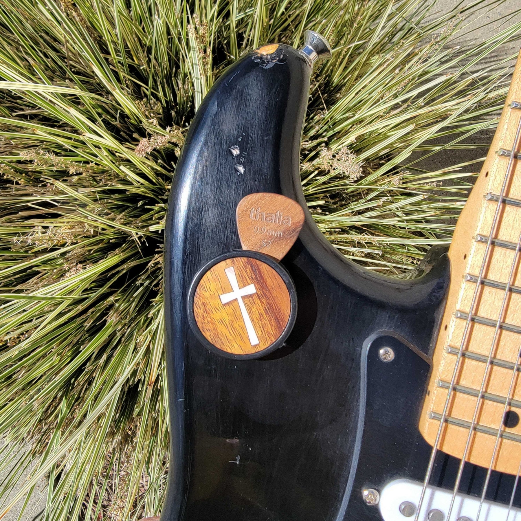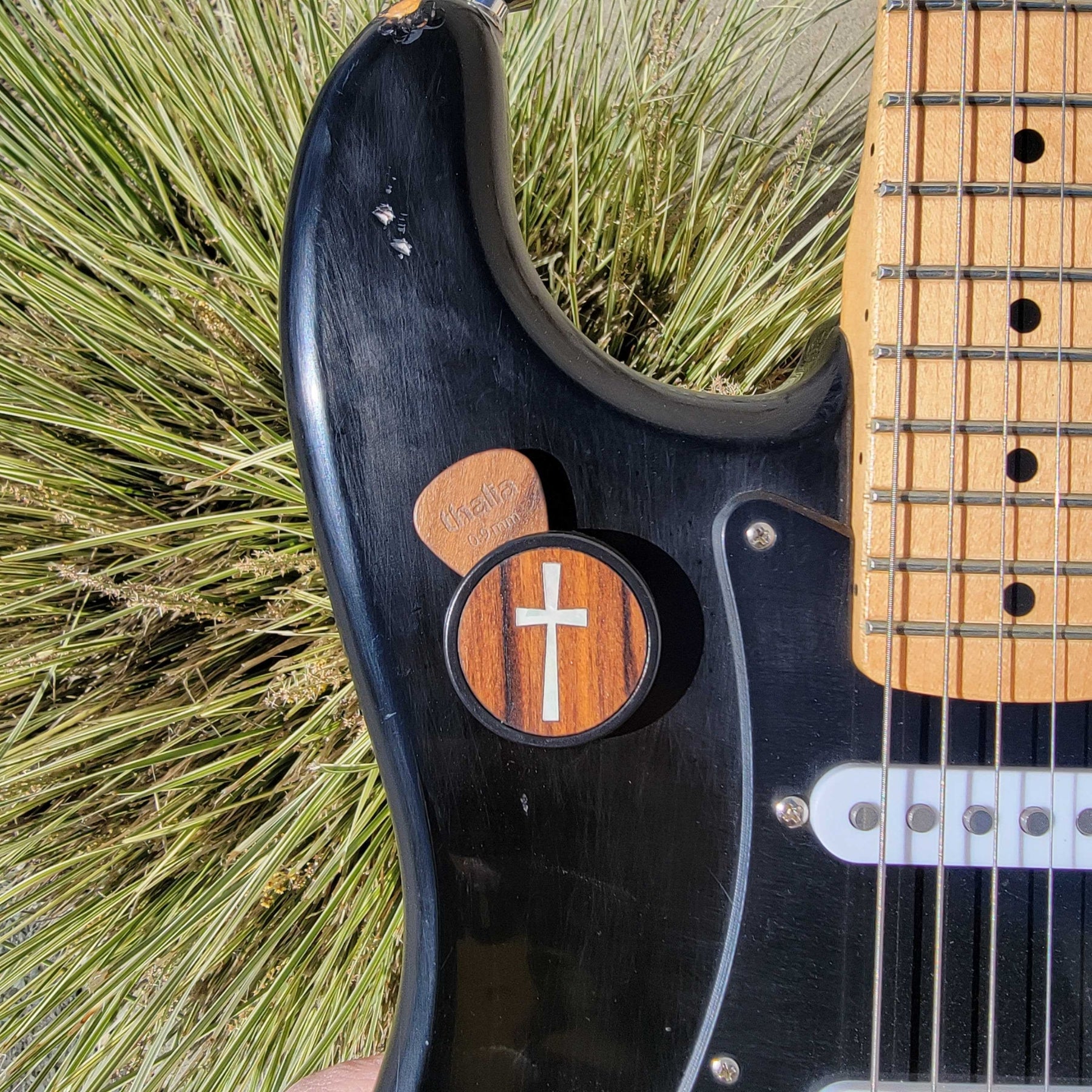 Custom inlaid with exotic wood and a Pearl Cross, our patent-pending pick puck is the ultimate guitar pick holder.  Stick anywhere that is most convenient for you!  See photos below for application ideas!