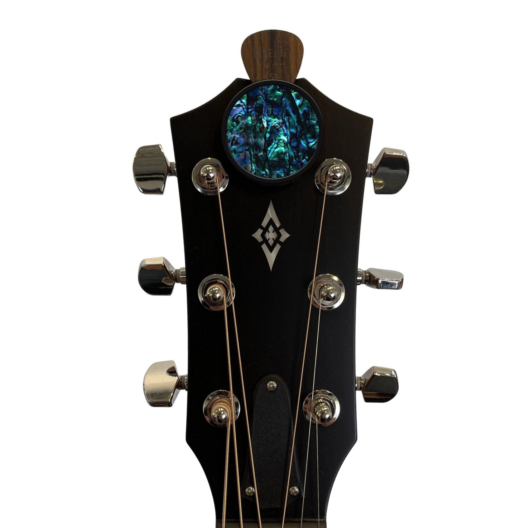 Custom inlaid with blue abalone shell, our patent-pending pick puck is the ultimate guitar pick holder. Stick anywhere that is most convenient for you! See photos below for application ideas!