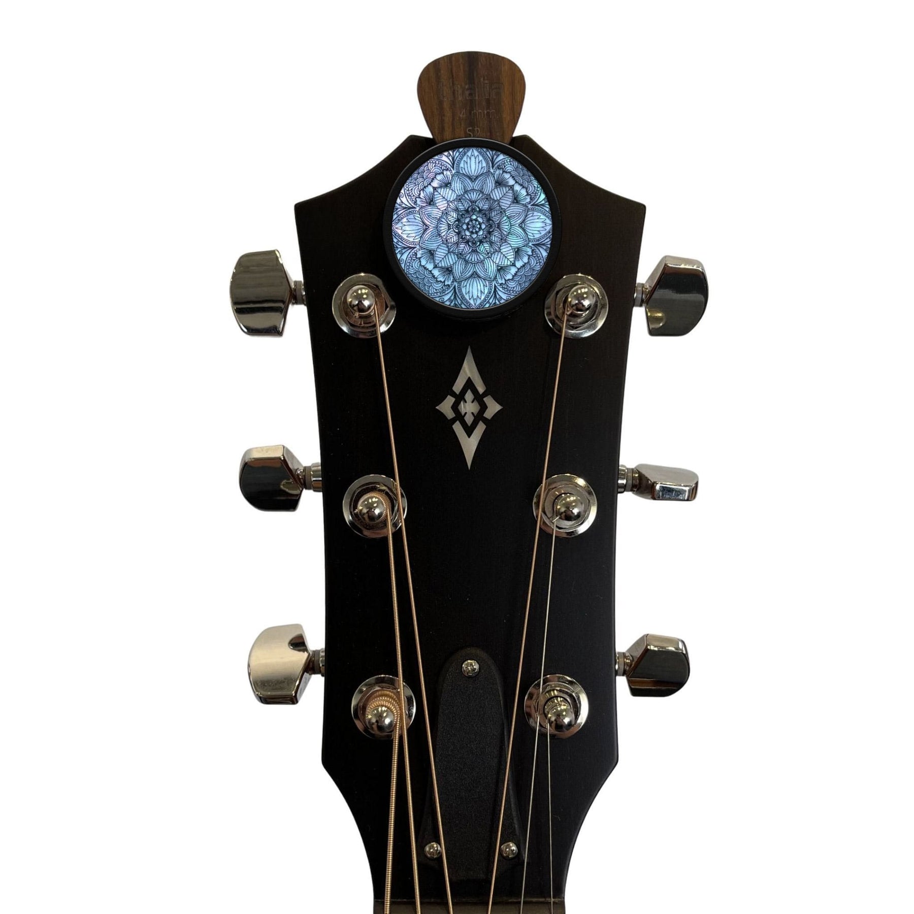 Custom inlaid with the an intricate Mandala UV-Embossed on pearl shell, our patent-pending pick puck is the ultimate guitar pick holder. Stick anywhere that is most convenient for you! See photos below for application ideas!