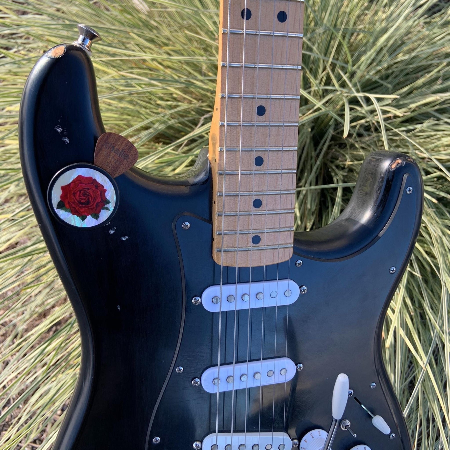 Custom inlaid with a deep Red Rose, UV-Embossed on mother of pearl, our patent-pending pick puck is the ultimate guitar pick holder.  Stick anywhere that is most convenient for you!  See photos below for application ideas!