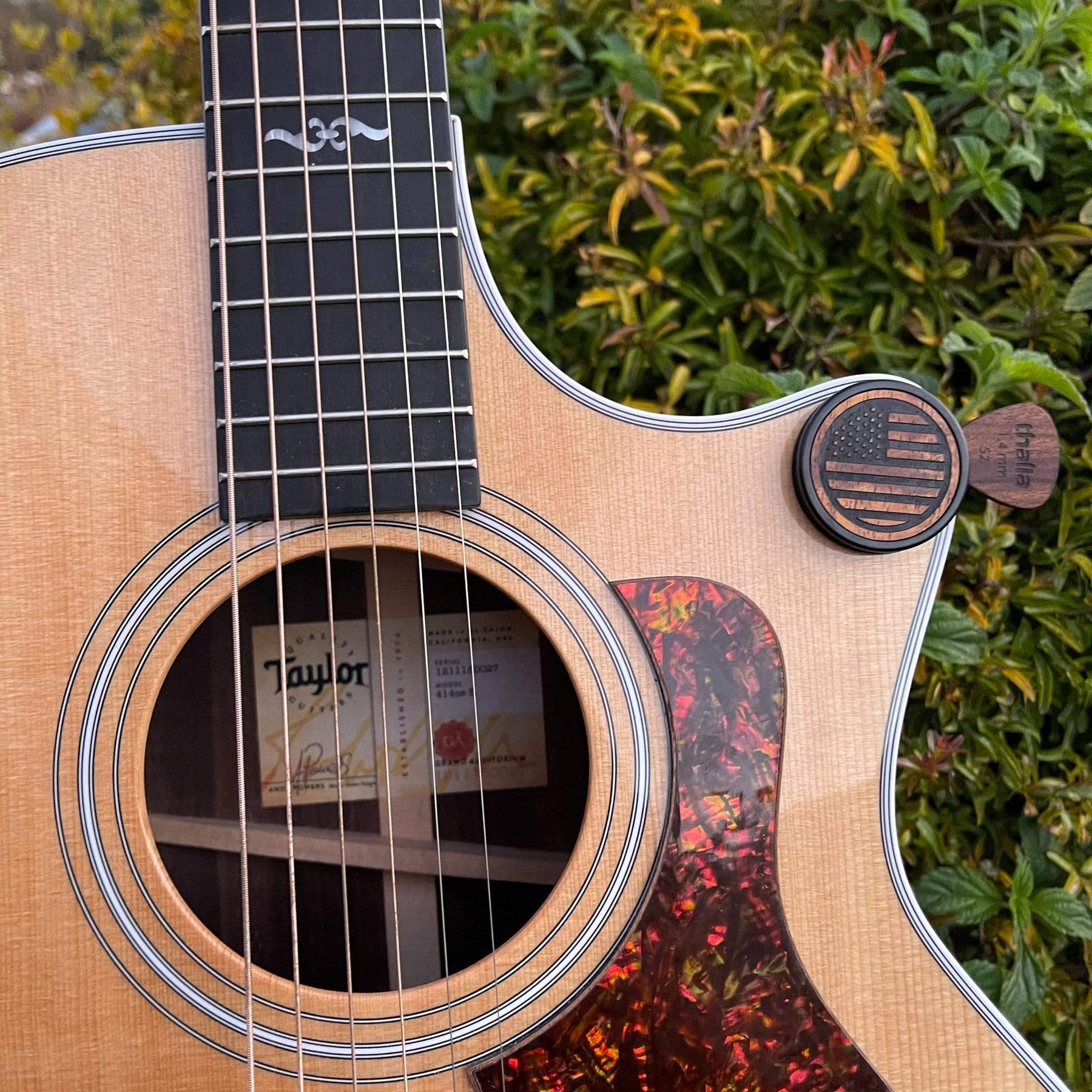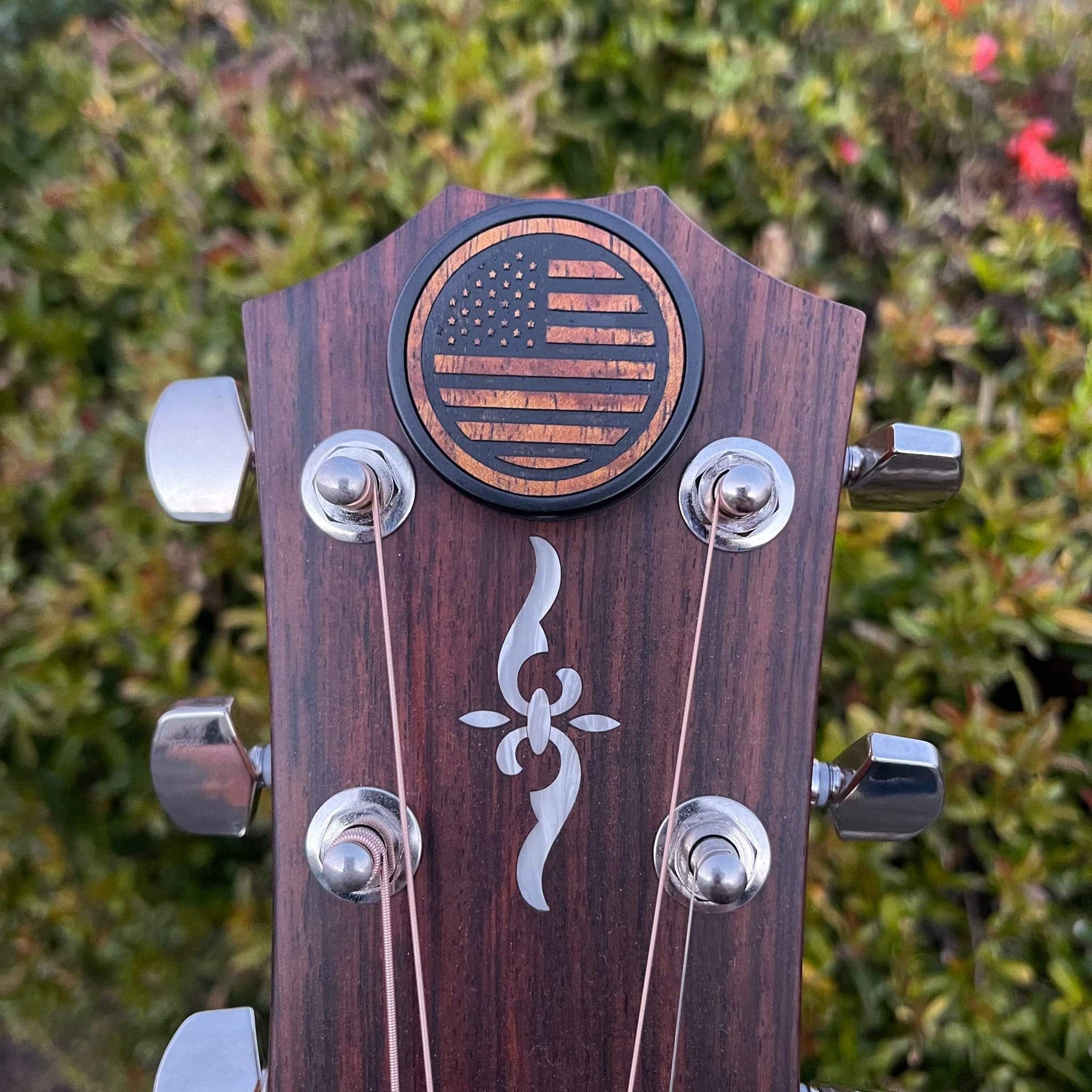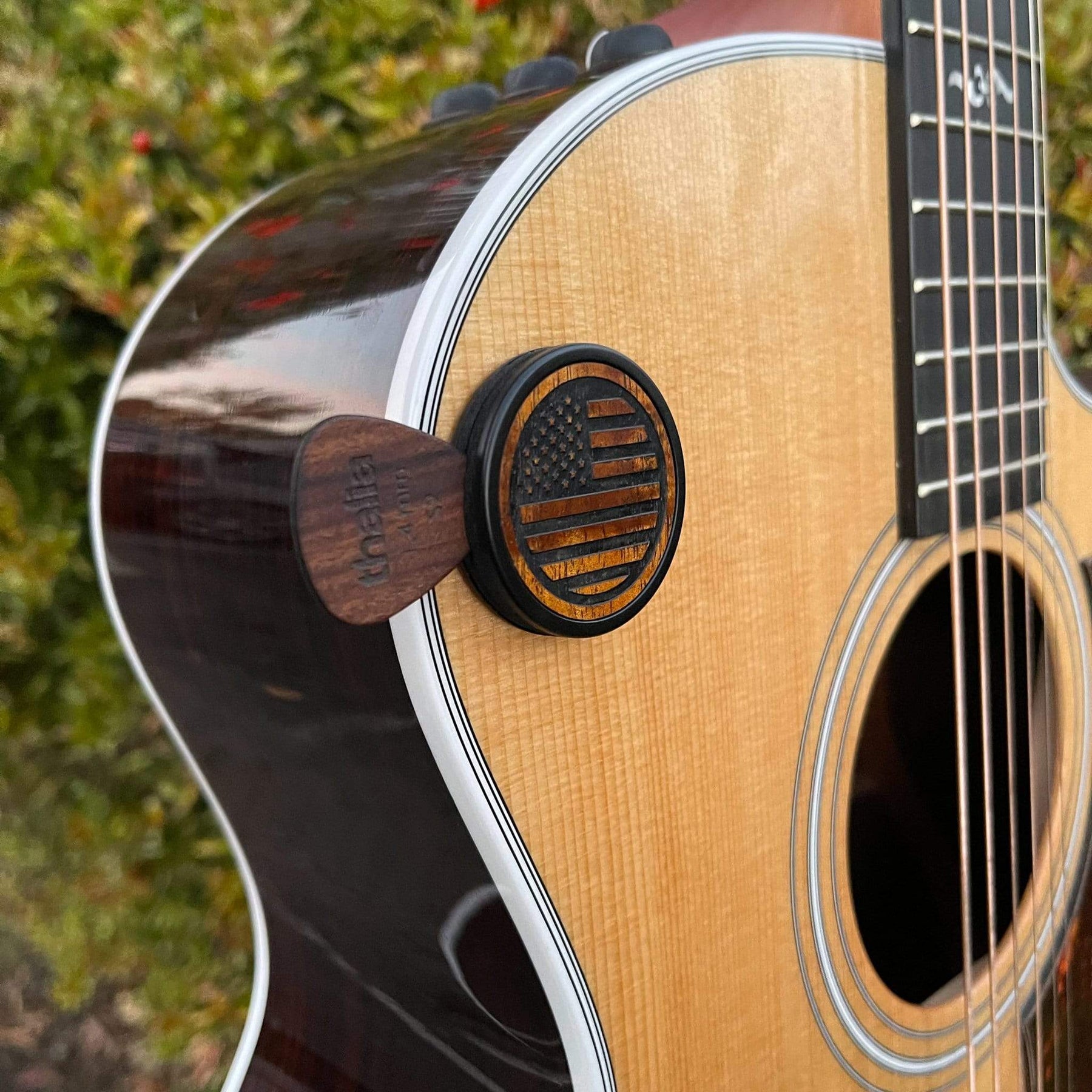 Custom inlaid with Old Glory engraved in Hawaiian Koa, our patent-pending pick puck is the ultimate guitar pick holder.  Stick anywhere that is most convenient for you!  See photos below for application ideas!
